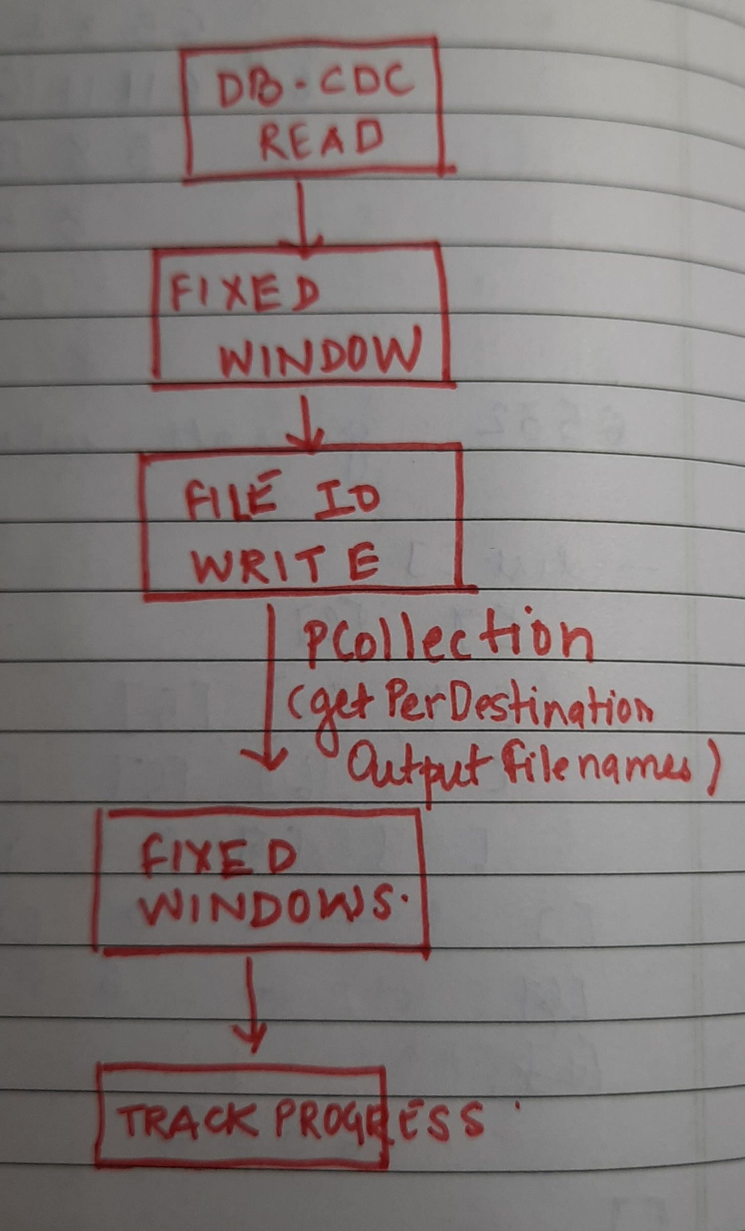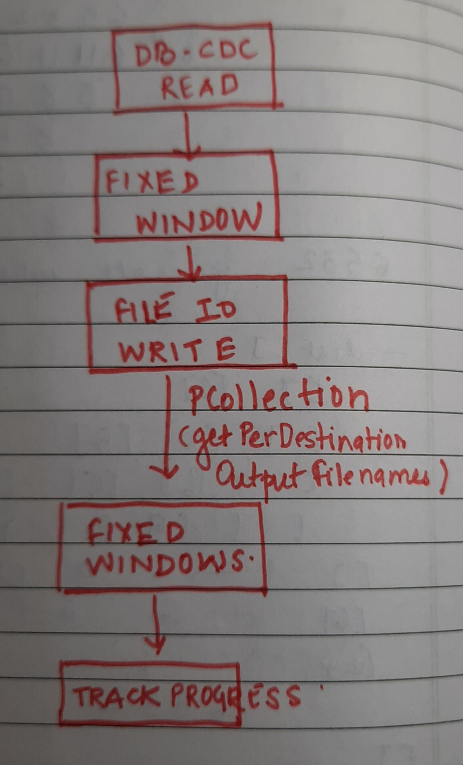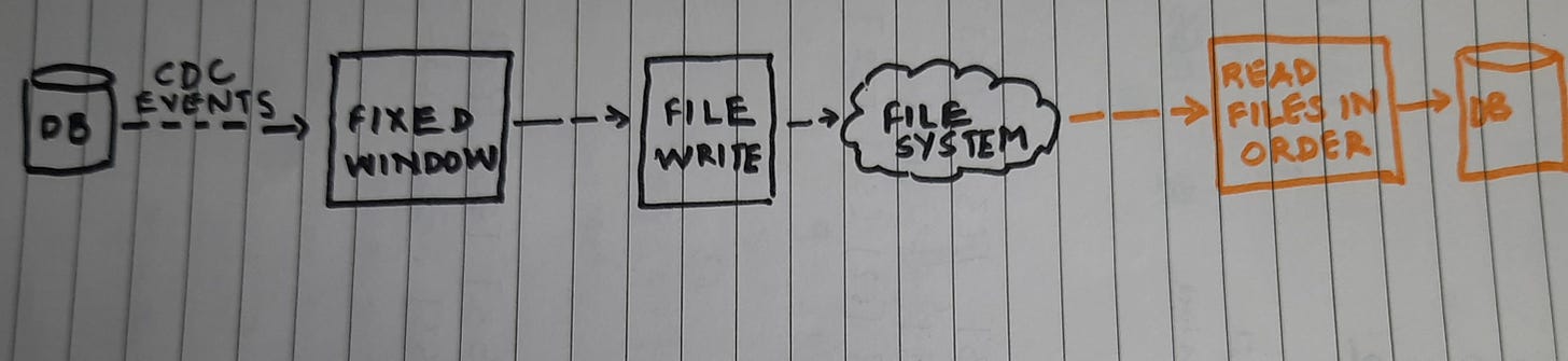 I needed a streaming pipeline to replicate data from one database to another. It was a heterogeneous replication, the two databases were of different vendors. The source database CDC events were streamed and split into fixed windows . This neatly split CDC data was written to files. The second streaming pipeline would read the file in temporal order and convert it’s data to target database schema and write to database.