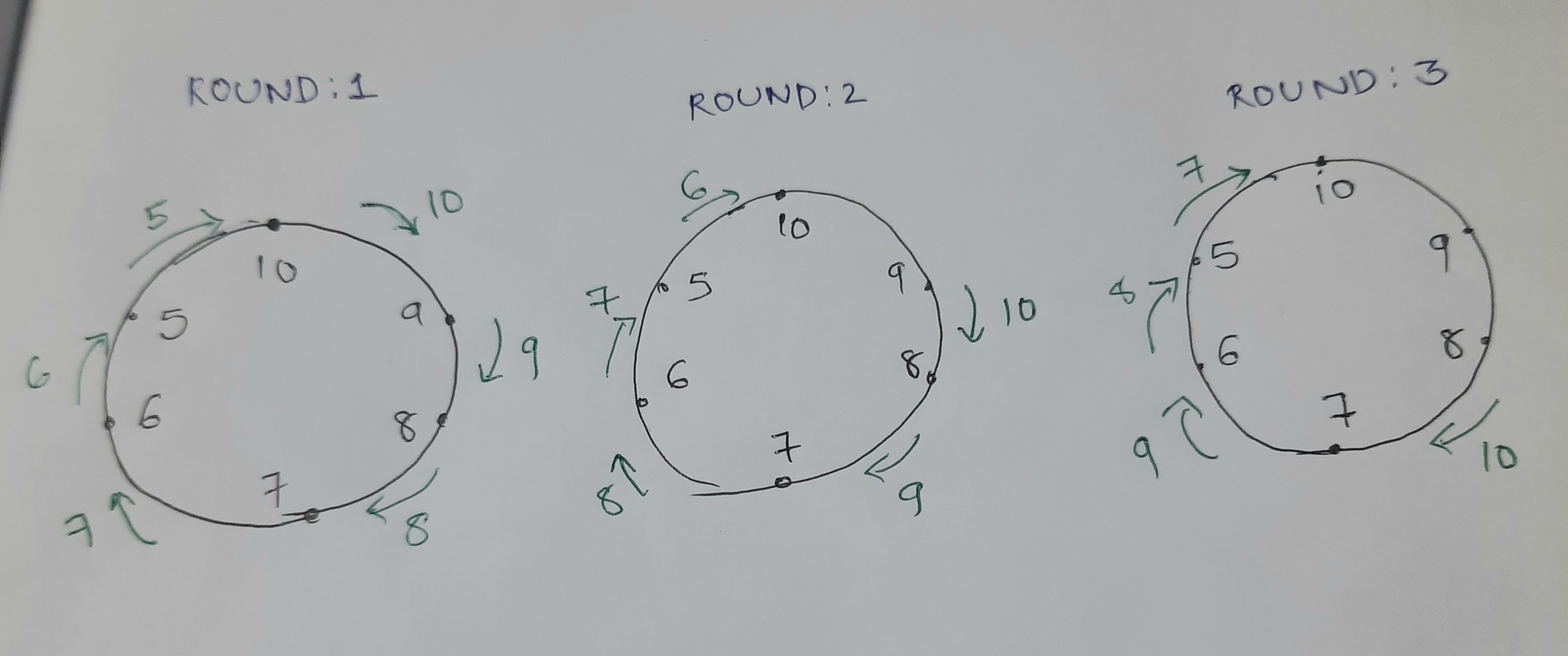 Each process is either in active or relay mode. In the relay mode, the process just forwards messages. In active mode, the process sends it’s UID to it’s immediate two neighbors in the clockwise direction.
