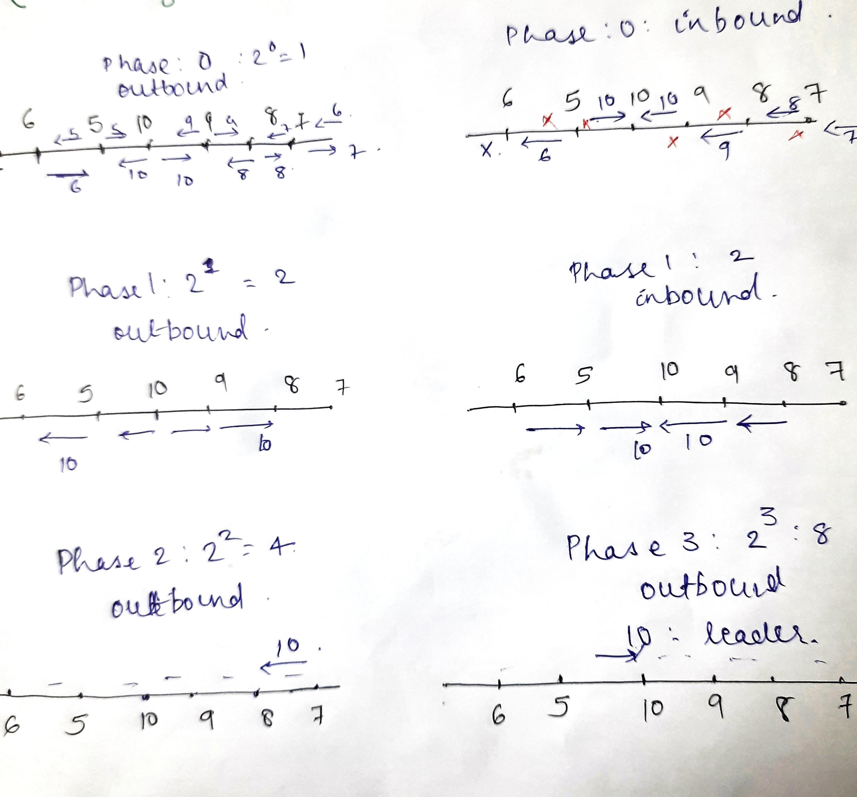 There are phases to this algorithm. In each phase i, process sends out it’s UID in both directions to neighbors that are 2^i distance away. Then it waits for those many hops for the messages to arrive. If both the tokens arrive back, it proceeds to the next phase. If the process gets it’s own UID in the outbound direction, then it is the leader. If one or neither of the tokens arrive, the process drops out as there are processes with a greater UID out there.