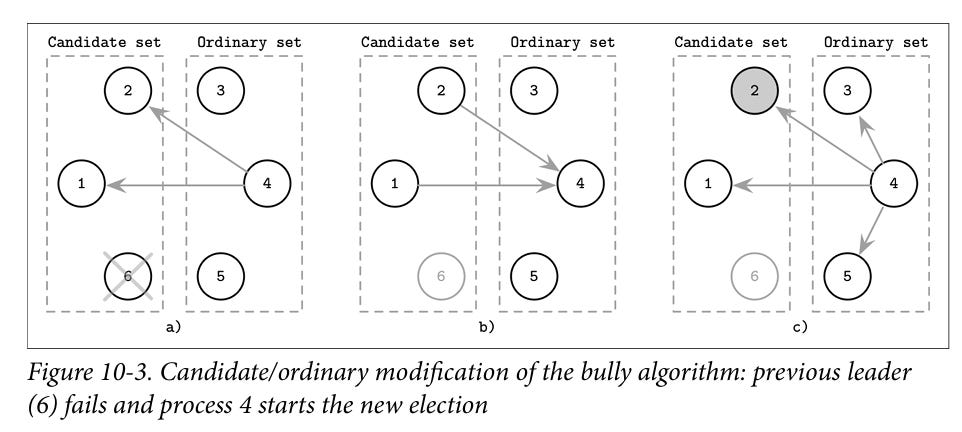 Another variant is the Candidate/Ordinary set algorithm. Here the nodes are divided into two sets: candidate set has set of nodes that can become leaders, ordinary set contains all other nodes. In case of leader failure, the prober process from the ordinary set sends messages to all live nodes from the candidate set. The response with the highest UID becomes the leader.