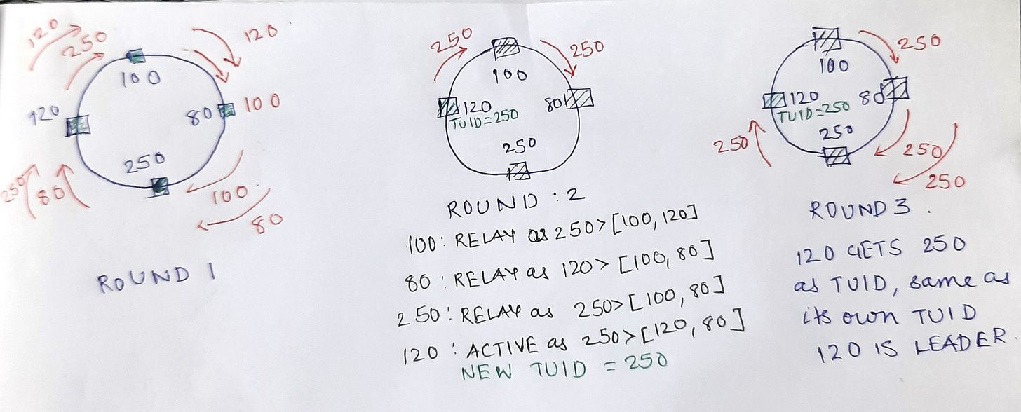 Each active process sends this TUID message over the ring and the active process that gets back this TUID message becomes the leader.