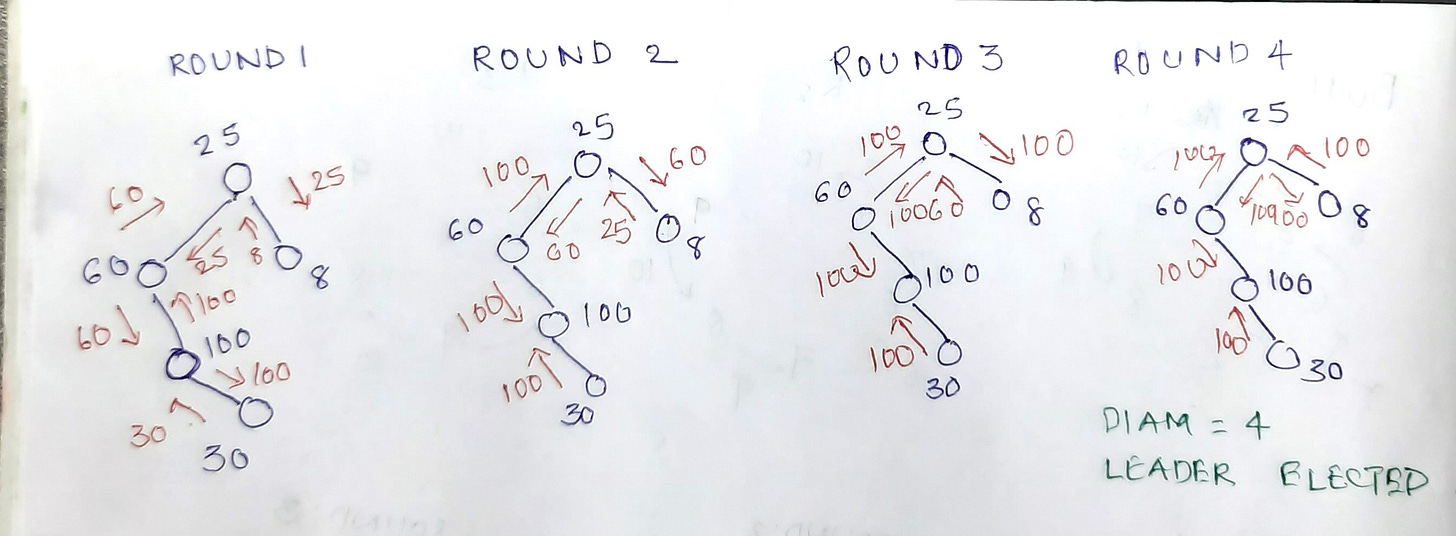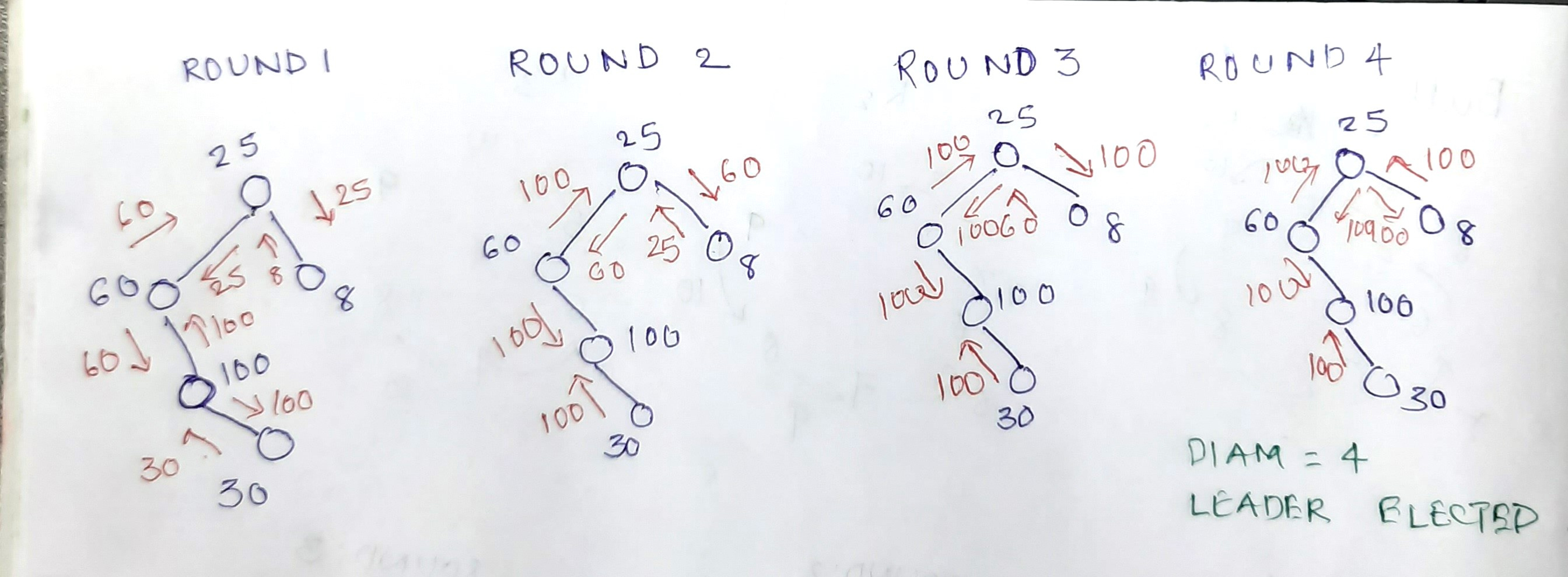 The algorithm takes place in rounds. In each round a node sends the highest UID it has seen thus far to it’s immediate connected nodes. The algorithm starts with each node sending it’s own UID. The nodes that gets back it’s own UID at the end of diam rounds is the leader.