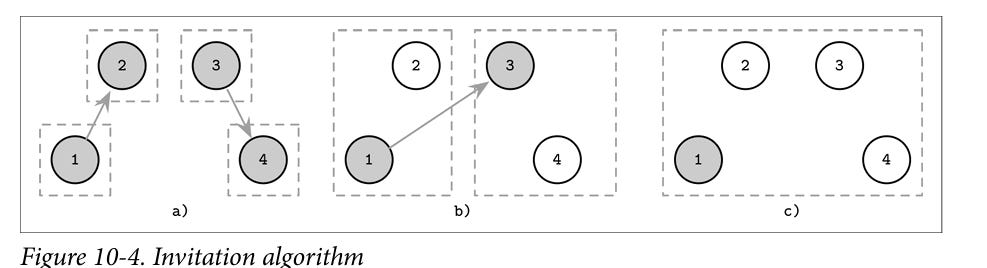 This is a lot like the union-find algorithm. It could also be viewed as a good way to initialize the network to elect the first leader. Each node is initially the leader. Then it contacts subsequent nodes to join it’s group, if the contacted node is also a leader, then the groups are merged, else the leader of the group is contacted. Eventually there is just one elected leader.