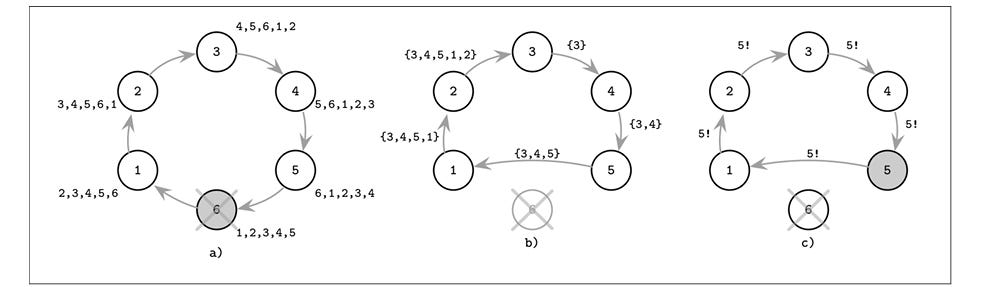 This algorithm is similar to LCR, however, there is just one node that identifies a failed leader sending the message to it’s next live neighbor with it’s UID. This node appends it’s own UID to the message set and sends it across. When the payload with set of messages arrives at the originating node, it identifies the process with the largest UID and sends that as the leader messages over the ring. Note that LCR is more optimized in terms of the payload size.